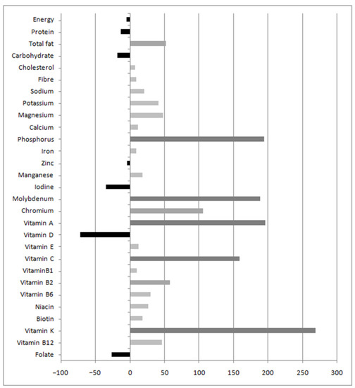 Figure 2 illustrates the comparison of the nutrients intake with the dietary reference values for each nutrient for pregnant women [30]. Percentages of the relative difference from the values were near or above the dietary reference values. Some micronutrients doubled or tripled the recommendations, such as vitamin K (268.5%), vitamin C (158.7%), vitamin A (195.6%), molybdenum (188.7%) and phosphorus (194.1%). Conversely, other nutrients such as iodine (−35.4%), vitamin D (−72%) and folate (−27%) were notably below the recommended values.