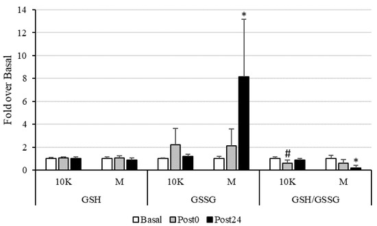 Reduced (GSH) and oxidized (GSSG) glutathione concentrations, as well as GSH/GSSG ratio, expressed as fold over Basal, trough the different races and timepoints. 10K: 10 km race; M: Marathon race. Basal: sample collected within 1 h before each race; Post0: sample collected within 10 min after the race; Post24: sample collected 24 h after Basal. * Significantly different (p < 0.05) from Basal and Post0; # Significantly different (p < 0.05) from Basal and Post24. Data are presented as mean ± standard deviation. Sample size, N = 9.