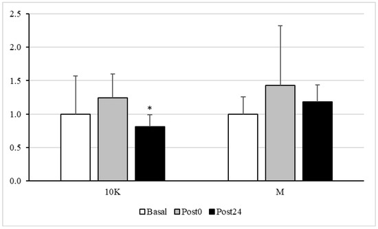 Plasma protein carbonyl, expressed as fold over Basal, trough the different races and timepoints. 10K: 10 km race; M: Marathon race. Basal: sample collected within 1 h before each race; Post0: sample collected within 10 min after the race; Post24: sample collected 24 h after Basal. * Significantly different (p < 0.05) from Basal and Post0. Data are presented as mean ± standard deviation. Sample size, N = 9.