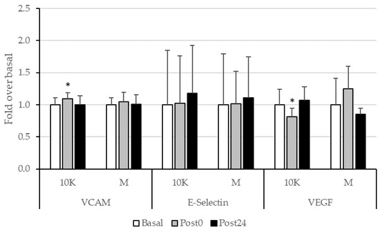 Adhesion molecules (VCAM-1 and E-Selectin) and VEGF, expressed as fold over Basal, trough the different races and timepoints. 10K: 10 km race; M: Marathon race. Basal: sample collected within 1 h before each race; Post0: sample collected within 10 min after the race; Post24: sample collected 24 h after Basal. * Significantly different (p < 0.05) from Basal. Data are presented as mean ± standard deviation. Sample size, N = 9.