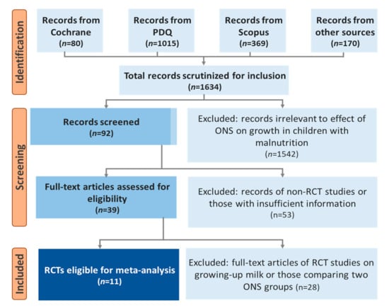 We searched Cochrane, ProQuest Dialog (PQD), Scopus, and other relevant sources for randomized controlled trials (RCTs) investigating the effects of ONS on growth among children below 18 years of age who had varying degrees of undernutrition as indicated by anthropomorphic measures, and who did not have chronic diseases. Our search strategy included the following keywords: (oral nutrition* supplement*) AND (weight OR height OR growth) AND (malnutrition OR malnourish* OR undernutrition OR undernourish*). The detailed search strategy for PQD can be found in Supplementary Table S1. The bibliographic references of all selected studies and review articles were manually screened for additional eligible studies. An attempt to obtain additional data was also made by direct contact with authors in the field of interest. The last search was run on 12 April 2021.
