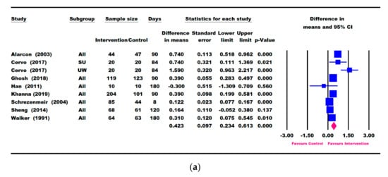 Eight studies (Alarcon [23], Cervo [53], Khanna [57], Ghosh [50], Han [48], Schrezenmeir [47], Sheng [49], and Walker [54]) reported outcomes in weight gain (“catch-up weight”) from baseline (Figure 2a).