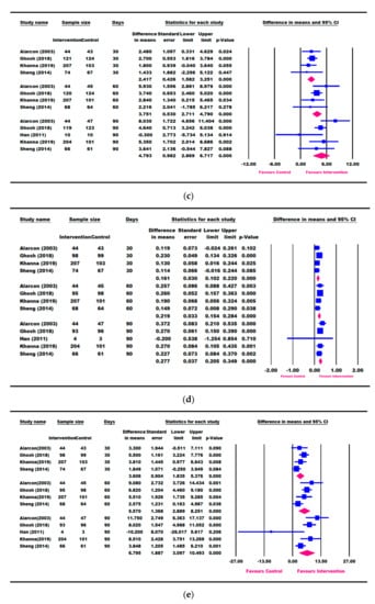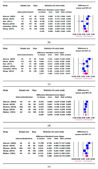 For continuous variables, we recorded the mean change from baseline and the SD for each group. Studies using standard errors instead of SDs were converted to SDs. Estimates of the treatment effect were created by calculating the mean difference (MD) and the corresponding 95% CI.