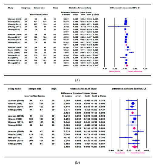 Eight RCTs reported outcomes within a period of 30–90 days (Alarcon [23], Han [48], Sheng [49], Lebenthal [51], O’Reilly [55], Cervo [53], Ghosh [50], Khanna [57]). Four of those RCTs reported results for multiple intervention time points including 30, 60, and 90 days (Alarcon [23], Khanna [57], Ghosh [50], and Sheng [49]). These four RCTs consistently covered children 2–6 years old and were all designed to compare ONS + DC vs. DC alone. Different types of interventions were used in the remaining studies, including (1) usual diet + nutrient-fortified milk-based formula vs. usual diet (Cervo [53]); (2) a nutritional supplement with or without synbiotics vs. a non-ONS fruit-flavored drink (Schrezenmeir [47]); (3) daily nutritional supplementation vs. observation (Han [48]); (4) a milk-based supplement providing the total protein requirement vs. home diet, both study arms with or without psychosocial stimulation (Walker [54]); (5) a sachet of a nutritional supplementation formula to be combined with water vs. a placebo supplement (Lebenthal [51] and Rawat [58]). For studies with multiple ONS arms (Schrezenmeir [47] and Khanna [57]), the outcomes for the different ONS intervention groups were pooled and then compare to the control group.