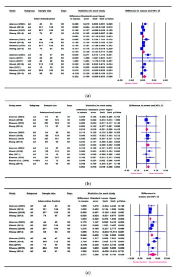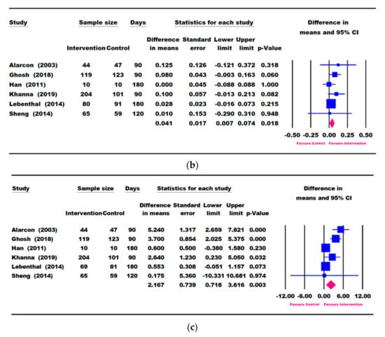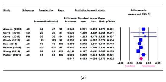 Seven studies (Alarcon [23], Cervo [53], Khanna [57], Ghosh [50], Han [48], Sheng [49], and Walker [54]) reported change in height (cm) (Figure 4a), and all except Cervo [53] reported changes in HAZ and HAP (Figure 4b,c). A meta-analysis using the longest follow-up time point showed that children in the ONS group had significantly greater catch-up growth in height (0.417 [0.059, 0.776] cm, p = 0.022), HAZ (0.041 [0.007, 0.074], p = 0.018), and HAP (2.167 [0.718, 3.616], p = 0.003) compared with the control group (Figure 4).