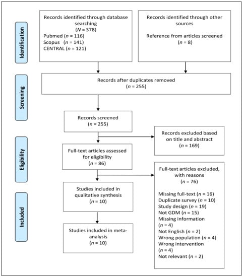 The total of electronic search and manual screening of article references returned 386 citations (Figure 1). After deduplication, a total of 255 records were screened, and 169 were excluded because of their irrelevant titles and abstracts. The full texts of the remaining 86 records were assessed for eligibility, and only ten studies were included in the final qualitative and quantitative analyses. A total of 76 studies were excluded because of the reasons described in the study selection process (Figure 1). The general characteristics of the ten included studies are summarized in Table 1. All the included RCTs implemented a parallel-arm and double-blind design comparing probiotics with placebo. The studies were conducted in Iran [,,,,,,,], Thailand [], and Ireland []. The publication date ranged from 2015 to 2019. All the participants of the included studies were assessed for GDM status with a “one-step” 2-h 75 g oral glucose tolerance test (OGTT), and only one study [] employed a “two-step” 3-h 100 g OGTT during the second trimester onwards. The earliest assessment was conducted at 18 weeks of gestation. GDM diagnosis was performed according to the American Diabetes Association (ADA) guidelines. Meanwhile, GDM diagnosis for three studies was performed according to the International Association of Diabetes and Pregnancy Study Groups [], Australian Diabetes in Pregnancy Society [], and O’Sullivan’s diagnostic criteria []. Lindsay et al. [] included pregnant women diagnosed with impaired glucose tolerance (IGT) and GDM. In total, 594 pregnant women with GDM and not on any hypoglycemic agents were included in the present review and meta-analysis. They were evenly and randomly divided into probiotics and placebo groups. The mean age of the participants ranged from 26.5 to 33.5 years. Six studies recruited only primigravida [,,,,,,], and one study recruited primigravid and multigravid women []. Five studies [,,,,] documented the pre-intervention washout period for probiotics (between 1 week and 3 months), and only two studies [,] reported the pre-intervention washout period for antibiotics (4 weeks).