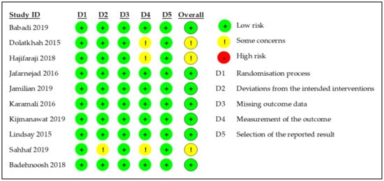Risk of bias summary: reviewers’ judgement on the risk of bias item for included studies. Green symbol represents low risk of bias (RoB), yellow symbol represents unclear RoB, and red symbol represents high RoB.