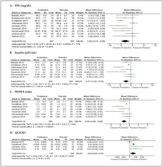 Meta-analysis of probiotics versus placebo on glycemic outcomes: (A) FPG, fasting plasma glucose; (B) insulin, (C) HOMA, homeostasis model assessment index; and (D) QUICKI, quantitative insulin sensitivity check index.