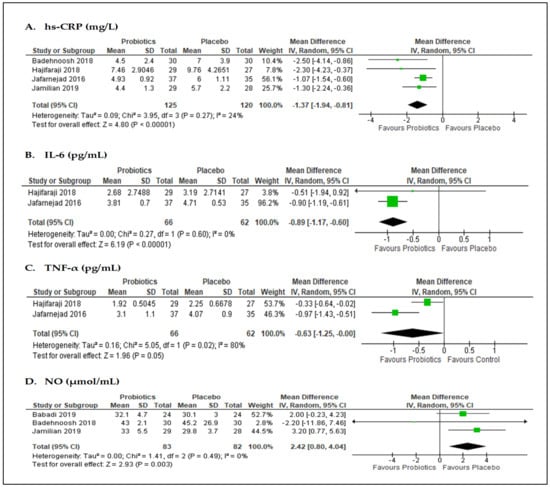 The effect of probiotics on high-sensitivity C-reactive protein (hs-CRP) was reported in four studies [,,,] (n = 245 participants; Figure 4A). The meta-analysis of data from these studies showed that hs-CRP levels were significantly reduced in the probiotics group versus placebo, with MD of −1.37 mg/L (95% CI = −1.94, −0.81; p < 0.001; I2 = 24%). Similarly, the pooled data from two studies [,] (n = 128 participants) showed that interleukin-6 (IL-6) levels (MD −0.89 pg/mL; 95% CI = −1.17, −0.60; p < 0.001; I2 = 0%; Figure 4B) and tumor necrosis-alpha (TNF-α) levels (MD −0.63 pg/mL; 95% CI = −1.25, −0.00; p = 0.05; I2 = 80%; Figure 4C) significantly decreased in the probiotics group compared with the placebo. Three studies [,,] (n = 165 participants) reported the effects of interventions on nitric oxide (NO) levels (Figure 4D). However, the pooled data showed that probiotics supplementation did not contribute to the reduction in NO level (MD 2.42 µmol/L; 95% CI = 0.80, 4.04; p = 0.003; I2 = 0%).
