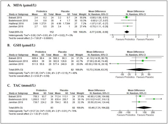 Overall, four studies [,,,] (n = 221 participants) reported the effects of probiotics on malondialdehyde (MDA) levels (Figure 5A). The pooled data from these studies showed probiotics significantly decreased the level of MDA in comparison to placebo with MD of −0.77 µmol/L (95% CI = −0.99, −0.56; p < 0.001; I2 = 0%). No significant difference in effect was observed with probiotics versus placebo for other oxidative biomarkers. The pooled data for glutathione (GSH) and total antioxidant capacity (TAC) levels from three studies [,,] (n = 165 participants) showed MD 13.73 µmol/L (95% CI = −35.84, 63.31; p = 0.59; I2 = 48%; Figure 5B) and MD 93.46 mmol/L (95% CI = −7.31, 194.22; p = 0.07; I2 = 78%; Figure 5C), respectively.