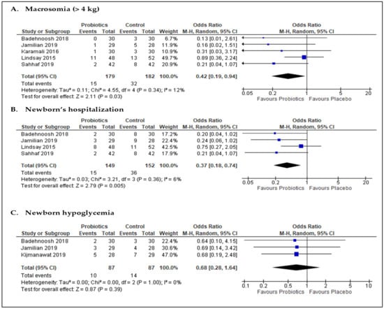 Five studies [,,,,] (n = 361 participants; Figure 6A) reported the number of babies with macrosomia. The meta-analysis of data from these studies indicated the odds of macrosomia was significantly lower in the probiotics group than in the placebo group (OR 0.42; 95% CI = 0.19, 0.94; p = 0.03). Heterogeneity observed was low, with I2 of 12%. Likewise, the pooled data from four studies [,,,] (n = 301 participants; Figure 6B) suggested that the likelihood of newborns’ hospitalization for all reasons was significantly lower in the probiotics group than in the placebo group (OR 0.37; 95% CI = 0.18, 0.74; p = 0.005; I2 = 6%). Three studies [,,] (n = 174 participants) reported the number of babies with hypoglycemia at birth. The pooled data from these studies resulted in an OR of 0.68 (95% CI = 0.28, 1.64; p = 0.39) and an I2 of 0%, indicating no significant difference between the two intervention groups (Figure 6C).