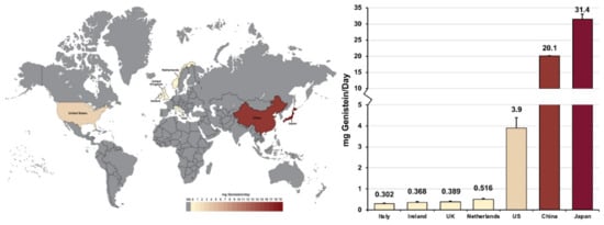 Secondly, the data in Table 2 also shows that both residents of Asian countries and Asian minority populations in Western countries consume significantly more soy products and, therefore, have higher serum genistein levels than other populations. This is further displayed in Figure 1, and validated when considering that China is the world’s largest importer of soybeans, consuming roughly one-third of the global annual soybean harvest []. However, evidence suggests that eating a soya-rich diet, as vegetarians and vegans commonly do [], can elevate daily genistein intake levels among individuals to a similar degree. British women who consumed soya regularly were reported to have a daily soya-product consumption that rivals that of Japanese adults consuming a traditional diet [].