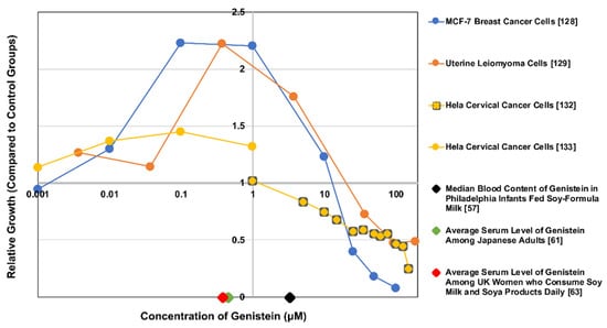 Relative growth of several cell lines at variable concentrations of genistein overlaid with serum levels of genistein for three populations. Data from [,,,,,,]. Note that no (0) genistein marks a value of 1 relative growth unit. This is considered the control group for all studies. Also, note that none of the cell lines were reported to be prominent metabolizers of genistein. Concurrently, the serum concentration studies only assessed circulating genistein, while its metabolites (likely the most predominant forms in vivo) would presumably also have effects on the cell lines.