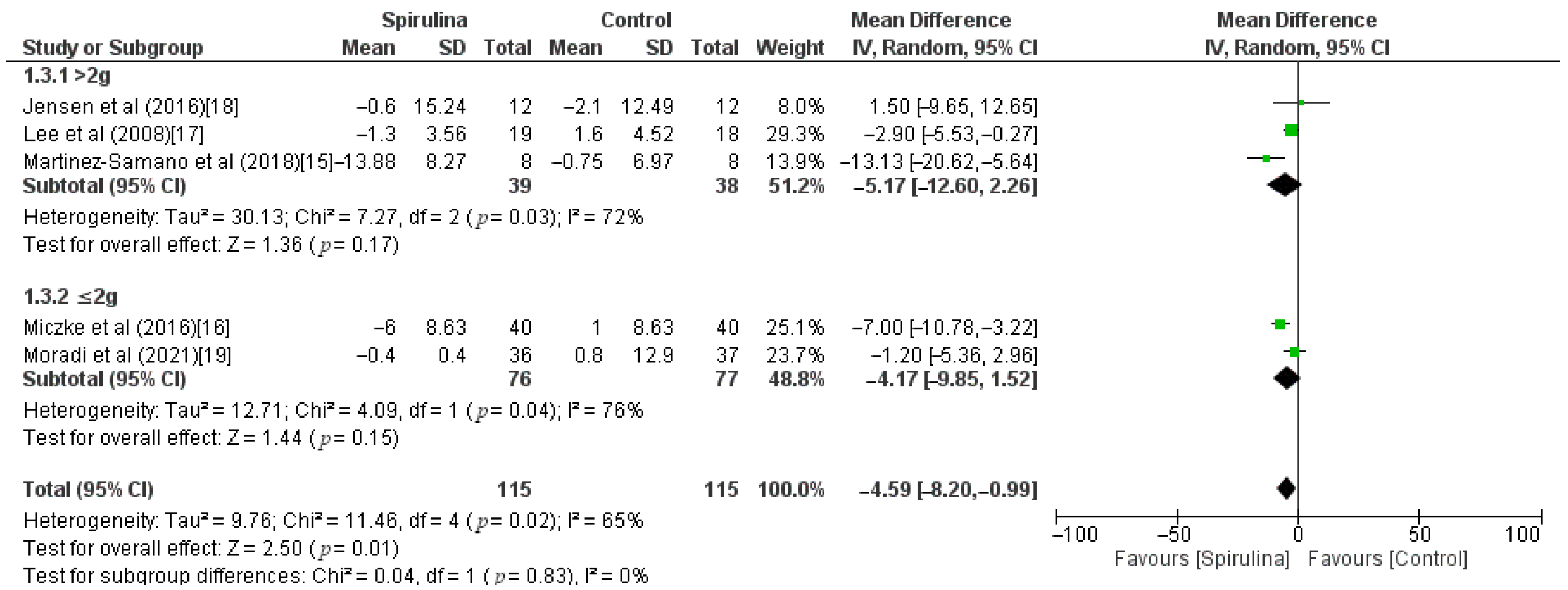 | Interventions | Oral daily supplementation of Spirulina (1 g, 2 g, 2.3 g, 4.5 g, 8 g) for 2, 8, or 12 weeks |