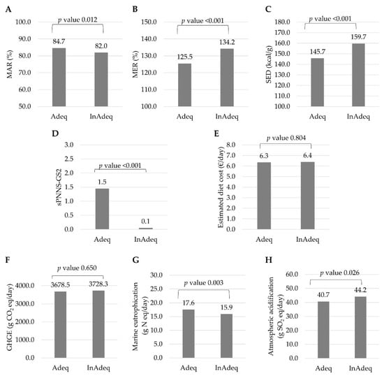 Nutritional quality (panel A: mean adequacy ratio; panel B: mean excess ratio; panel C: solid energy density; panel D: sPNNS-GS2) and environmental (panel F: greenhouse gas emissions; panel G: marine eutrophication; panel H: atmospheric acidification) indicators and estimated diet cost (panel E) of observed diets fulfilling (Adeq) and not fulfilling (InAdeq) the recommended guideline for pulses (equivalent to 57 g/day). Values are means adjusted for energy intake, gender, and diet status. MAR, Mean adequacy score; MER, Mean excess ratio; SED, Solid energy density; sPNNS-GS2, simplified Programme National Nutrition Santé Guideline Score 2; GHGE, Greenhouse gas emission.