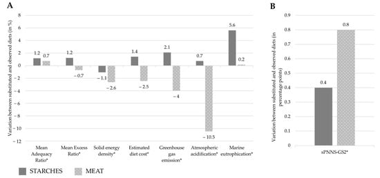 Variation in % of nutritional quality, estimated diet cost and environmental indicators (panel A) and in percentage points for sPNNS-GS2 (panel B) between diets obtained with the STARCHES scenario (iso-portion replacement of starches with pulses until the French recommended guideline for pulses is reached) or with the MEAT scenario (iso-portion replacement of meat with pulses until the French recommended guideline for pulses is reached) and the observed InAdeq diets (observed diets not reaching the recommended guideline for pulses, i.e., 57 g/day) (n = 1853). Values are means adjusted for energy intake. sPNNS-GS2, simplified Programme National Nutrition Santé Guideline Score 2. *: indication of a significant difference (p value < 0.05) between diets obtained with the STARCHES or MEAT scenarios and observed InAdeq diets, after adjusting on the energy content of diets.