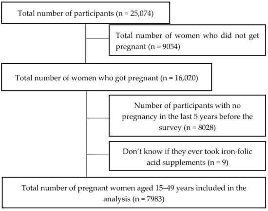 This study is a secondary analysis using data from the 2017 Philippine National Demographic and Health Survey (PNDHS) with the permission from the Demographic Health Survey Program. The PNDHS is a cross-sectional study using two-stage sampling techniques to obtain household samples from the entire country [11]. Further information about sampling techniques and survey methodology can be obtained from the PNDHS final report [11]. A total of 25,074 women aged 15–49 years completed the individual interviews during the survey, of which 16,020 had a history of pregnancy. Of the 16,020 interviewed participants, 7983 (49.8%) were included in the analysis for having been pregnant within five years before the survey (Figure 1).