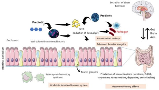 Mechanisms of prebiotic and probiotic action in modulating bidirectional gut−brain axis. A healthy human gut is unable to digest macronutrients, including plant-derived polysaccharides. Probiotics produce enzymes to digest the fibers and carbohydrates to produce short-chain fatty acids (SCFA) in the form of lactic acid and acetic acids. Prebiotics serve as a source of nutrition for the stimulation and propagation of commensal bacteria in the gut. The presence of SCFA reduces the pH of the intestinal lumen, preventing the growth of pathogen, or it has anti-microbial activity. Certain probiotic strains could restore the intestinal barrier function by increasing the expression of tight junction proteins as well as mucus-secretion genes. They also help modulate the intestinal immune system by reducing the amount of pro-inflammatory cytokines. In addition, probiotics exhibit neuromodulatory effects by enhancing neurochemical production in the gut, including serotonin, GABA, tryptamine, noradrenaline, dopamine, and acetylcholine. As cytokines and neurotransmitters will impair the integrity of the blood−brain barrier, this leads to potentially damaging effects of inflammatory or pathogenic elements that link to the central nervous system to secrete stress hormones.