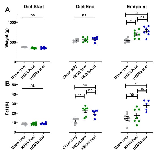 (A) Weight (g) of chow-only (grey, n = 7), HED/chow (green, n = 7) and HED/isocal (blue, n = 7) rats at the beginning of the first diet, after 10 weeks on HED or chow, and the endpoint/ day of tissue collection. (B) Percent body fat of chow-only (grey, n = 7), HED/chow (green, n = 7), and HED/isocal (blue, n = 6) rats at the beginning of the first diet, after 10 weeks on HED or chow, and the endpoint/day of tissue collection. Stars represent statistical significance, where * = p < 0.05; ** = p < 0.01; ns denotes non significant. Bars represent means plus/minus SEM. HED = high energy diet; isocal = isocalorically fed.