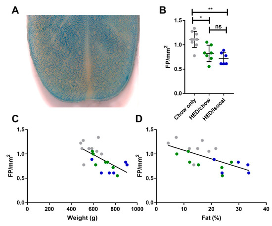 (A) Representative image of anterior tongue, with fungiform papillae the pink regions not taking up methyl blue dye. (B) Fungiform Papillae (FP) density in rats consuming chow-only (grey, n = 9), high-energy diet (HED) then chow (green, n = 7), and HED then HED isocaloric (blue, n = 6). (C) Fungiform papillae (FP) per mm2 (y-axis) versus Weight (g) (x-axis). Chow-only (grey, n = 9), HED then chow (green, n = 7), and HED then HED isocaloric (blue, n = 6). Pearson’s r = −0.646, p = 0.0012. (D) Fungiform papillae (FP) per mm2 (y-axis) versus Body Fat (%) analyzed by DXA scan (x-axis). Chow-only (grey, n = 9), HED then chow (green, n = 7), and HED then HED isocaloric (blue, n = 6). Pearson’s r = −0.655, p = 0.002. ns denotes non significant; * denotes p < 0.05; ** denotes p < 0.01.