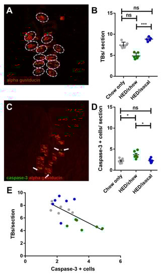 (A) Representative image of circumvallate papilla with α-gustducin (red) staining higlighting taste buds. (B) Number of taste buds (TBs) per CV section for all treatment groups. Chow-only (grey, n = 6), high-energy diet (HED) then chow (green, n = 7), and HED then HED isocaloric (blue, n = 6). Overall p = 0.029. Y-axis shows taste buds per section. (C) Representative image of circumvallate papilla showing caspase-3 (green), α-gustducin (red). (D) Caspase-3 positive cells per CV section for all treatment groups. Chow-only (grey, n = 6), HED then chow (green, n = 7), and HED then HED isocaloric (blue, n = 6). Bars represent means plus/minus SEM. Overall p = 0.001. (E) Number of taste buds/ section (y-axis), caspase + cells (x-axis). Chow-only (grey, n = 6), HED then chow (green, n = 7), and HED then HED isocaloric (blue, n = 6). Pearson’s r = −0.662, p = 0.003. ns denotes non significant; * denotes p < 0.05; *** denotes p < 0.001.