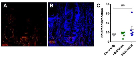 As apoptosis was implicated in earlier work on obesity-driven taste bud loss and diabetes [,], CV taste sections were also stained for caspase-3. Rats fed HED/chow had a higher number of caspase-positive cells than chow-fed controls (p = 0.010) and HED/isocal-fed rats (p = 0.022) (Figure 3C,D). Moreover, the number of CV taste buds in all samples was inversely related to caspase 3-positive cells (Figure 3E, Pearson’s r = −0.662, p = 0.003). One outlier that was more than two standard deviations from the mean number of caspase positive cells was removed. Across groups there was no significant difference in the number of MPO-positive cells (p = 0.141), marking neutrophils, in the CV region (Figure 4).
