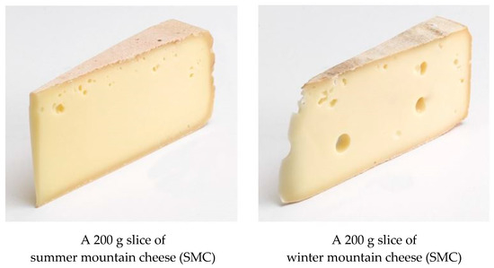 The auctioned products used in the study were two high quality mountain cheeses, produced in the summer (SMC) or winter (WMC) season. Specifically, participants were presented with two real pictures representing a 200 g slice of SMC and WMC that were taken by a professional photographer (Figure 1). The two types of auctioned mountain cheeses were produced using whole fresh milk using the same recipe by the one farm and differentiated by the season of production. The two products are sold in real markets using different names that recall the fact that one is produced during summer and the other during winter.