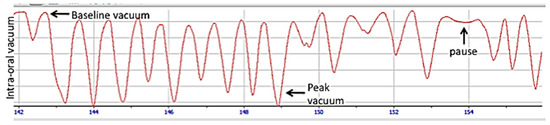 Breastfeeding consists of both nutritive (NS) and non-nutritive sucking (NNS). Non-nutritive sucking typically occurs at the beginning of a breastfeed to stimulate a ME and near the end of the breastfeed which may serve to satisfy an infant’s urge to suck and facilitate state regulation and self-comfort [125,134]. These two modes of sucking, NS and NNS, differ in both vacuum characteristics and tongue motion. Interestingly we have shown that mean peak vacuums during NS are stronger (−100 vs. −80 mmHg) than NNS suggesting the infant exerts stronger vacuum to actively remove milk effectively and efficiently [135].