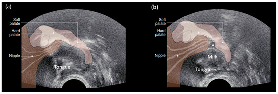 Ultrasound images of the infant oral cavity during breastfeeding (a) Tongue up position during breastfeeding. (b) Tongue down is drawn down to create a vacuum and milk flows into the oral cavity. ©Medela AG 2006. Used with permission.