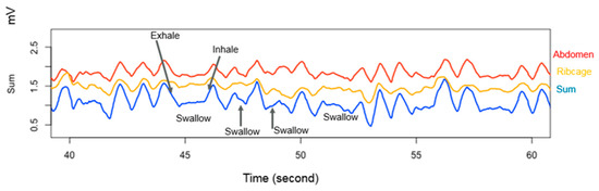 Respiratory traces of a breastfeeding infant using respiratory inductive plethysmography. Signals are recorded from the ribcage (yellow) and abdomen (red) and the sum of the two is calculated (blue). Absence of signal reflects a swallow, downward slope an exhale and upward stope an inhale. Geddes et al., unpublished.