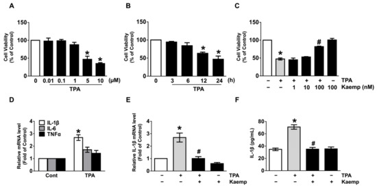 Figure 1. Regulatory effect of kaempferol on cytotoxicity and inflammation triggered by 12-O-tetradecanoyl phorbol-13-acetate (TPA). (A) Dose responses of TPA for 24 h in cell viability are shown. * p ≤ 0.01 vs. 0 µM. n = 3. (B) Time responses of 5 µM of TPA are shown. * p ≤ 0.01 vs. 0 h. n = 3. (C) Normal human dermal fibroblasts (NHDF) were treated with kaempferol and TPA for 24 h. * p ≤ 0.01 vs. control. # p ≤ 0.05 vs. TPA alone. n = 3. + and − represent the cells treated with and without agents, respectively. (D) NHDF was treated with TPA for 24 h. The effect of TPA on the expression of pro-inflammatory cytokines was evaluated by qRT-PCR. * p ≤ 0.001 vs. control. n = 3. (E) NHDF was exposed to the TPA in the presence of kaempferol for 24 h. The IL-1β mRNA level is shown. * p ≤ 0.001 versus control. # p ≤ 0.05 vs. TPA alone. n = 3. (F) The level of IL-1β production regulated by kaempferol in TPA-treated NHDF for 24 h was quantified by ELISA. * p ≤ 0.01 vs. control. # p ≤ 0.01 vs. TPA alone. n = 3.