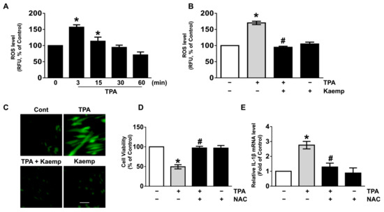 Figure 2. Kaempferol reduces the production of reactive oxygen species (ROS) in NHDF treated with TPA. (A) Time response of TPA on the level of ROS production were evaluated. * p ≤ 0.05 vs. 0 min. n = 3. RFU, relative fluorescence units. (B) NHDF was exposed to the kaempferol and TPA for 3 min. * p ≤ 0.05 vs. control. # p ≤ 0.01 vs. TPA alone. n = 3. (C) The blocking effect of kaempferol on ROS production induced by TPA (green) revealed by confocal microscopy is shown. Scale bars, 100 μm (magnification × 100). n = 3. Cells were treated with 1 μM of N-acetylcysteine (NAC) as an antioxidant for 30 min prior to TPA exposure for 24 h. The level of cell viability (D) and IL-1β mRNA (E) is shown. * p ≤ 0.01 versus control. # p ≤ 0.01 vs. TPA alone. n = 3.