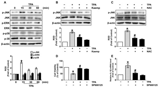 Figure 3. Kaempferol uniquely inhibits the c-Jun N-terminal kinase (JNK) pathways mediated by ROS. (A) Time response of TPA on the activation of MAPKs in NHDF were evaluated. * p ≤ 0.01 vs. 0 min. n = 3. ERK, extracellular signal-regulated kinases. ROD, relative optical density. (B) NHDF was exposed to the kaempferol and TPA for 15 min. * p ≤ 0.01 vs. control. # p ≤ 0.05 vs. TPA alone. n = 3. (C) Cells were treated with 1 μM of N-acetylcysteine (NAC) for 30 min prior to TPA exposure for 15 min. * p ≤ 0.01 vs. control. # p ≤ 0.01 vs. TPA alone. n = 3. Cells were treated with 1 μM of SP600125 for 30 min prior to TPA exposure for 24 h. The level of cell viability (D) and IL-1β mRNA (E) is shown. * p ≤ 0.01 vs. control. # p ≤ 0.01 vs. TPA alone. n = 3.