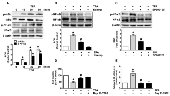 Figure 4. The role of kaempferol in the phosphorylation of NF-κB. (A) Time response of TPA on the phosphorylation IκBα and NF-κB in NHDF were evaluated. * p ≤ 0.01 vs. 0 min. n = 3. ROD, relative optical density. (B) NHDF was exposed to the kaempferol and TPA for 30 min. * p ≤ 0.01 vs. control. # p ≤ 0.05 vs. TPA alone. n = 3. (C) Cells were treated with 1 μM of SP600125 for 30 min prior to TPA exposure for 30 min. * p ≤ 0.01 vs. control. # p ≤ 0.01 vs. TPA alone. n = 3. Cells were treated with 1 μM of Bay 11-7082 for 30 min prior to TPA exposure for 24 h. The level of cell viability (D) and IL-1β mRNA (E) is shown. * p ≤ 0.01 vs. control. # p ≤ 0.05 vs. TPA alone. n = 3.
