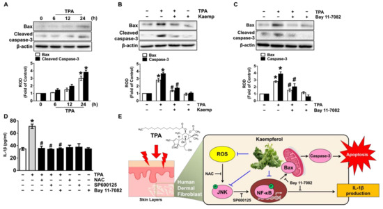 Figure 5. Kaempferol blocks dermal fibroblastic apoptosis and inflammation initiated by TPA. (A) Time response of TPA on the expression Bax and cleaved caspase-3 in NHDF were evaluated. * p ≤ 0.01 vs. 0 min. n = 3. ROD, relative optical density. (B) NHDF was exposed to the kaempferol and TPA for 24 h. * p ≤ 0.001 vs. control. # p ≤ 0.05 vs. TPA alone. n = 3. (C) Cells were treated with Bay11-7082 for 30 min prior to TPA exposure for 24 h. * p ≤ 0.001 versus control. # p ≤ 0.01 vs. TPA alone. n = 3. (D) Cells were treated with N-acetylcysteine (NAC), SP6001125, and Bay11-7082 for 30 min prior to TPA exposure for 24 h. The level of IL-1β production evaluated by ELISA is shown. * p ≤ 0.01 vs. control. # p ≤ 0.05 vs. TPA alone. n = 3. (E) The sequences of presumed signaling pathways regulated by kaempferol are summarized.