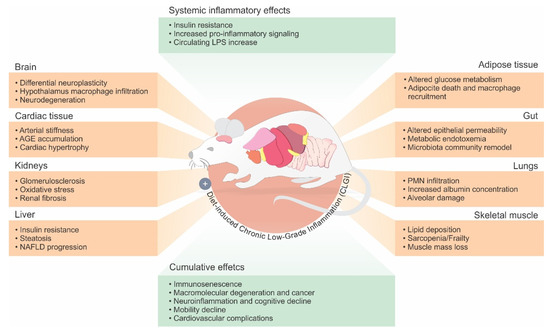 Physiological alterations resulting from diet-induced CLGI in different organs. CLGI is a complex crosstalk among different organs leading to an increase in local (tissue-specific) and circulating levels (systemic inflammatory effects) of inflammatory mediators. Organs and respective inflammatory mediators are referenced in Table 1. As a result, lifelong exposure to CLGI is also related to cumulative effects such as, macromolecular degeneration, neuroinflammation, and mobility reduction associate with age-related diseases with LGI components (Alzheimer’s disease). Such physiological modifications are related to the activation of inflammation, and tissue dysfunction. NAFLD = nonalcoholic fatty liver disease; PMN = polymorphonuclear leukocytes.