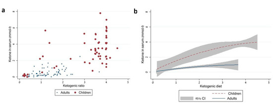The association between ketogenic ratio and blood ketone levels was noticeably different between children and adults, with the latter having far lower ketone levels (Figure 1).