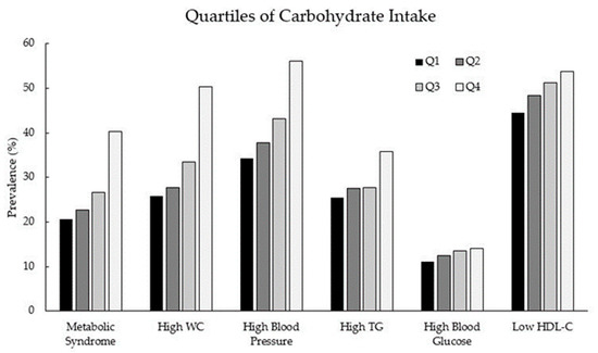 Prevalence of metabolic syndrome and its components according to the quartiles of carbohydrate intake. Q, quartile; TG, triglycerides; HDL-C, high-density lipoprotein/cholesterol; WC, waist circumference.