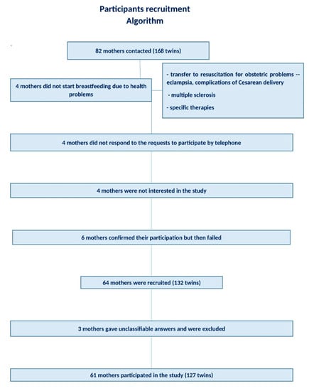 We enrolled mothers who gave birth to multiple babies at the “Casa Sollievo della Sofferenza” in the past 6 years. These women were called for preliminary information. Eighty-two women, mothers of 168 twins, were contacted by telephone, and 64 of them (132 twins) agreed to receive a questionnaire and 61 (127 twins) completed it. (Figure 1).