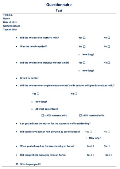 Twins’ birth data (delivery time, parity, birth weight) were obtained using the data collection systems present at NICU (Neocare—NICU, SISWEB-regional informatic system). Mothers’ information, like socio-demographic data (age, occupation, income, and educational level), were obtained from direct contact with the twins’ mothers through interviews using a questionnaire. Information about the use of DM (donated milk) was obtained from specific database (HMB Human Milk Bank database).
