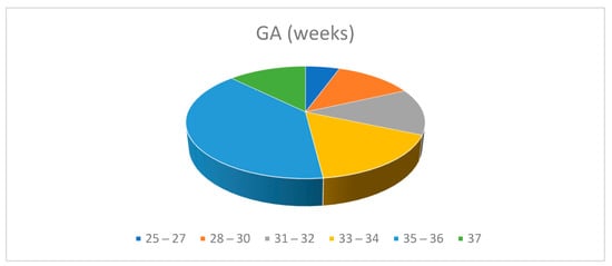 The gestational age for the multiples ranged between 25 and 37 weeks. 111 of 127 (87%) were premature infants: 40 twins (31.4%) were born at ≤32 weeks of gestational age and 16 (12.5%) at 37 weeks. (Table 5, Figure 5)