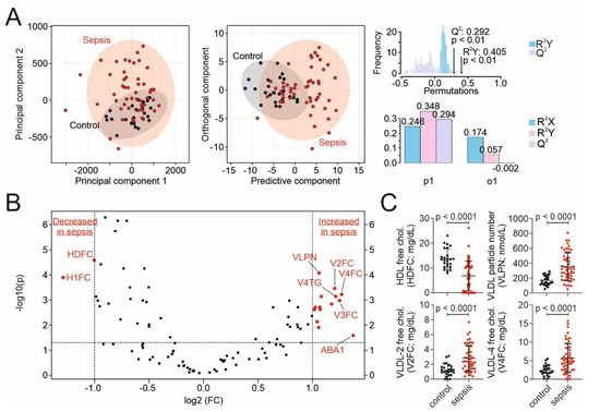 Targeted metabolomic assessment of lipoproteins. (A) Multivariate data analyses of lipoprotein parameters with principal component analyses (PCA) and orthogonal partial least squares discriminant analysis (O-PLS-DA) for the differentiation between ICU controls (black) and sepsis patients (red). PCA: principal component (PC) 1 of 76.8% and PC2 of 11.0%. O-PLS-DA: correlation coefficient R2Y = 0.405 and cross-validation score Q2 of 0.292 (p < 0.01). (B) Differences in lipoproteins between sepsis and control patients on a logarithmic scale (volcano plot). The vertical dashed lines mark the border to two-fold changes. The horizontal dashed line marks the level of significance at 0.05. (C) Boxplots of the most significant and most changed lipoproteins of sepsis (red color) and control (black color) patients. Abbreviations: HDFC = high density free cholesterol; H1FC = HDL-1 free cholesterol; VLDL = very-low-density lipoprotein; VLPN = VLDL particle number, V2FC = VLDL-2 free cholesterol; V3FC = VLDL-3 free cholesterol; V4FC = VLDL-4 free cholesterol; V4TG = VLDL-4 triglycerides; ABA1 = apolipoprotein B100 to apolipoprotein A-I ratio.