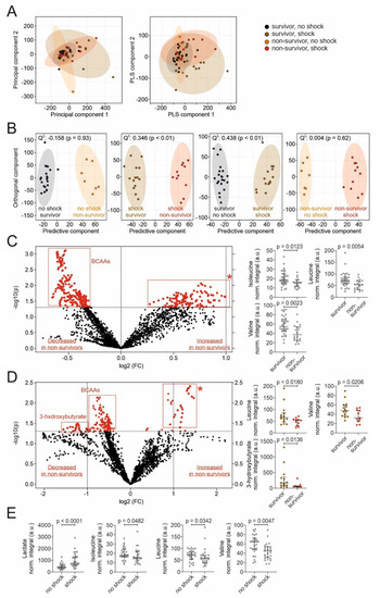 Untargeted metabolomic assessment of metabolites in sepsis. (A) Principal component analysis (PCA; left panel) and partial least squares discriminant analysis (PLS-DA; right panel) for the differentiation between the four groups of survivors and non-survivors, each for the shock and no-shock group. PCA: principal component (PC) 1 of 55% and PC2 of 14.3%. PLS-DA: Component 1 of 50.4%, Component 2 of 14.6%. (B) Pair-wise orthogonal partial least squares discriminant analysis (O-PLS-DA) showing acceptable clustering for survivors and non-survivor in the shock group (middle-left panel; Q2 = 0.346, p < 0.01), as well as survivors of the no-shock and shock group (middle-right panel; Q2 = 0.438, p < 0.01). No significant clustering was found for survivors and non-survivor in the no-shock group (left panel; p = 0.93) and for non-survivors of the no-shock and shock group (right panel; p = 0.62). (C) Differences in metabolites of all sepsis patients between survivors and non-survivors (volcano plot). The horizontal dashed line marks the level of significance at 0.05. The boxplots represent the most pronounced and most significant different metabolites. (D) Differences in metabolites of septic shock patients between survivors and non-survivors (volcano plot). The horizontal dashed line marks the level of significance at 0.05. The boxplots represent the most pronounced and most significant different metabolites. (E) Comparison between no-shock and septic shock patients. Boxplots of the most pronounced and most significant different metabolites. Abbreviations: BCAA = branched-chain amino acids (consisting of valine, leucine, and isoleucine). a.u. = arbitrary unit. * = unassigned metabolites.