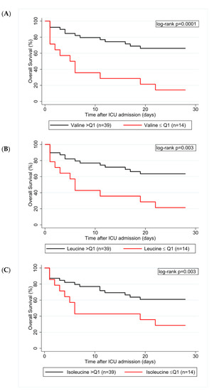 Kaplan–Meier estimates for valine (A), leucine (B), and isoleucine (C). The Q1, i.e., the 25th percentile, corresponds to a cutoff value for valine, leucine, and isoleucine of 33.3, 44.1, and 13.7 NSI units, respectively. The 28-day Kaplan–Meier survival estimates for patients below or above the respective cutoff were 14% vs. 66% for valine, 21% vs. 64% for leucine, and 29% vs. 61% for isoleucine. Abbreviations: Q1 = 25th percentile of the respective branched-chain amino acid, ICU = intensive care unit.