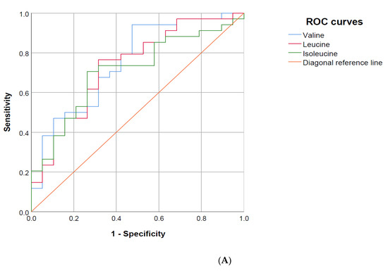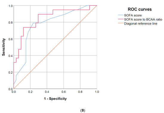 Area under the receiver operating characteristics (AUROC) of branched-chain amino acids for ICU-mortality. (A): AUROC for valine (blue line, 0.75 [0.62–0.89]), leucine (red line, 0.73 (0.59–0.88)) and isoleucine (green line, 0.71 (0.57–0.85)). (B): AUROC for the sequential organ failure assessment (SOFA) score (blue line, 0.78 (0.65–0.91)) and the SOFA-score to branched-chain amino acid ratio (red line, 0.85 (0.73–0.96)). The orange line is the diagonal reference line (50% chance).
