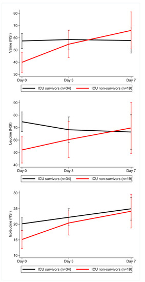 Longitudinal data of branched-chain amino acid levels. Mean levels of branched-chain amino acids (top panel: valine; middle panel: leucine; bottom panel: isoleucine) over time in sepsis survivors (black line) and sepsis non-survivors (red line) from day 0 to day 3 and 7 after admission. Survivors compared to non-survivors had significantly higher levels of branched-chain amino acids on day 0. Note that in the non-survivor cohort, lower branched-chain amino acids were associated with decreased time until death.