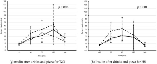 The postprandial levels of serum glucose and insulin after interventions with drink and drink + pizza are shown in Figure 1. In patients with T2D, the postprandial s-glucose levels increased over time, with differences between interventions after drinks (Figure 1a) and drinks + pizza (Figure 1c). The postprandial s-glucose levels were significantly higher after Coca-Cola and Coca-Cola + pizza compared to interventions with fructose and fructose + pizza (p = 0.007 and p = 0.029, respectively for repeated measure ANOVA). In HS, the postprandial s-glucose levels increased over time, with differences between interventions over time after drinks (Figure 1b) and drinks + pizza (Figure 1d). The postprandial s-glucose levels were significantly higher after intervention with Coca-Cola + pizza compared to fructose + pizza (p = 0.026, repeated measure ANOVA). In patients with T2D, s-insulin levels increased over time, with differences between interventions over time after drink + pizza (Figure 1g). In HS, the s-insulin levels increased significantly over time, with differences between the interventions over time after drinks (Figure 1f) and drinks + pizza (Figure 1h).