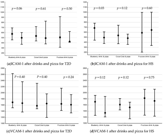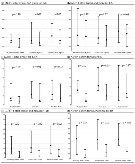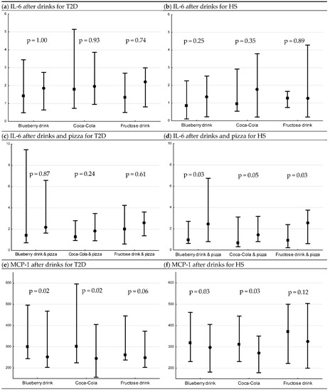 In the present study, we aimed to examine the acute postprandial effect of fructose, reflecting ad libitum consumption of fructose, using pure fructose drink (35 g fructose), European Coca-Cola (17.5 g fructose) and a blueberry drink (18 g fructose), without and with a pizza, on IL-6, IL-18, MCP-1, ICAM-1 and VCAM-1 levels in T2D and HS.