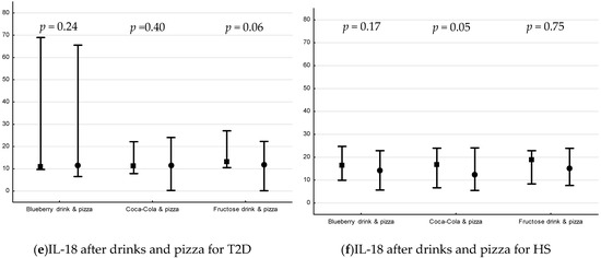 There were no changes in serum levels of IL-6 following drink interventions in any group (T2D; Figure 2a, HS; Figure 2b). The IL-6 levels increased significantly in HS after blueberry + pizza and fructose + pizza (Figure 2d), and there was an increase after Coca-Cola + pizza but the difference did not reach significant levels (p = 0.05). In contrast, no changes in postprandial IL-6 was observed in patients with T2D (Figure 2c).
