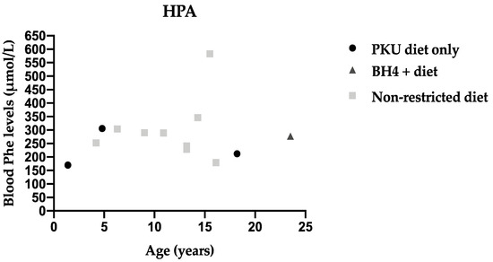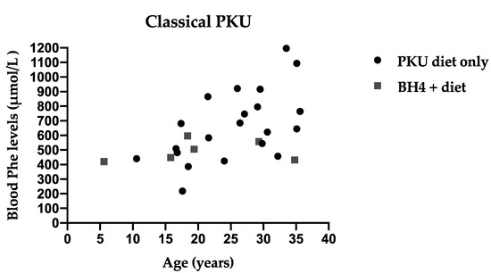 Blood Phe is used as the primary marker to evaluate metabolic control. Routine blood Phe is the only practical marker even though the aim of treatment is to prevent high Phe levels in the brain due to Phe transport across the blood brain barrier [1]. This is particularly important in early life when high Phe levels have a severe impact in brain and neurological development [14,15,16]. However, chronic long term high blood Phe levels in adulthood may also impact cognition and there are an increasing case studies of people with PKU developing neurological issues with increasing age [17,18,19]. International PKU guidelines give recommendations for target blood Phe levels which are essential to guide and monitor treatment, assess patient’s outcomes, and compare effectiveness of treatments [1,20].